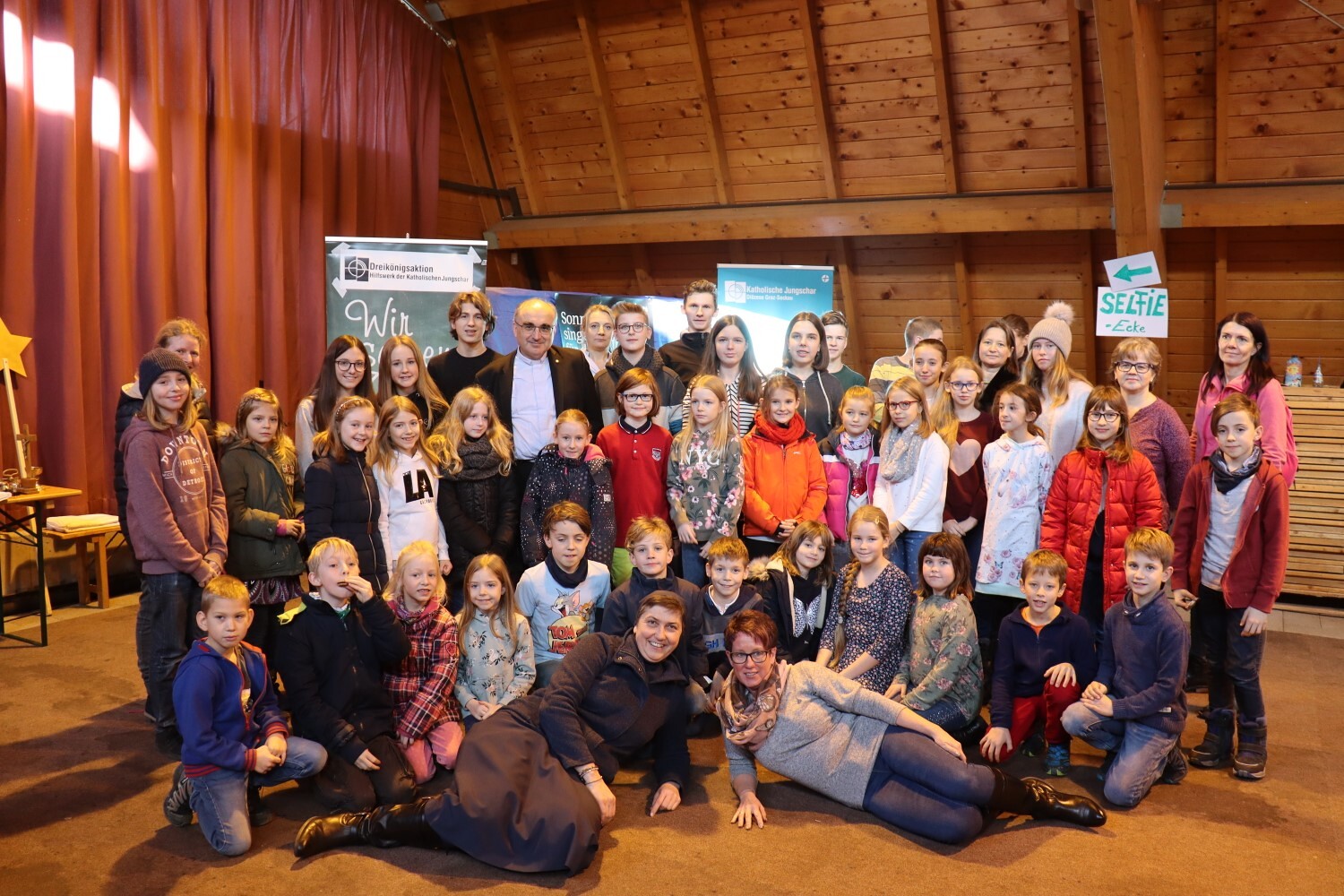 Gruppenfoto von Dobl und Lieboch mit Bischof Wilhelm Krautwaschl in der Sulmtalhalle in Pistorf