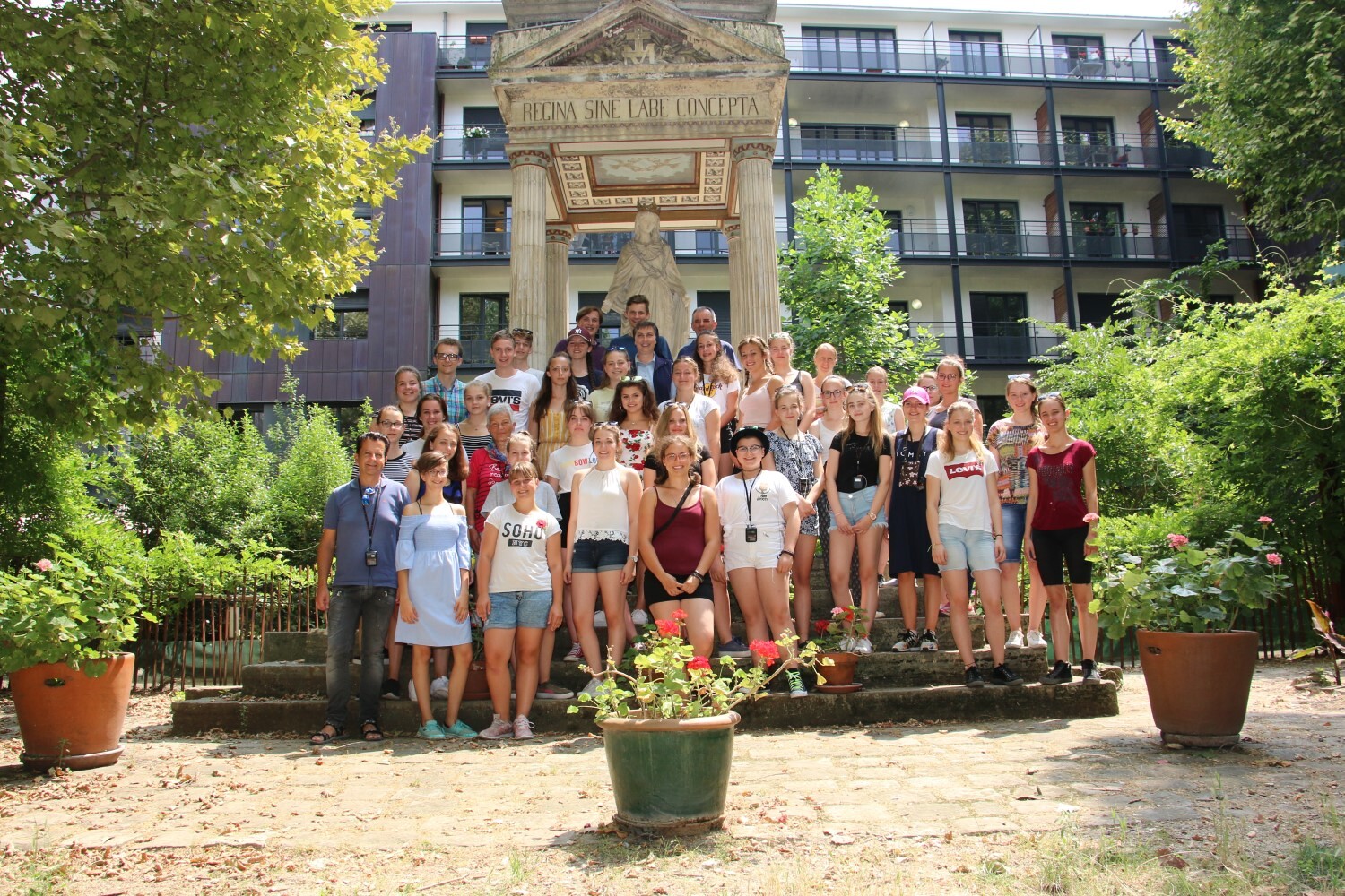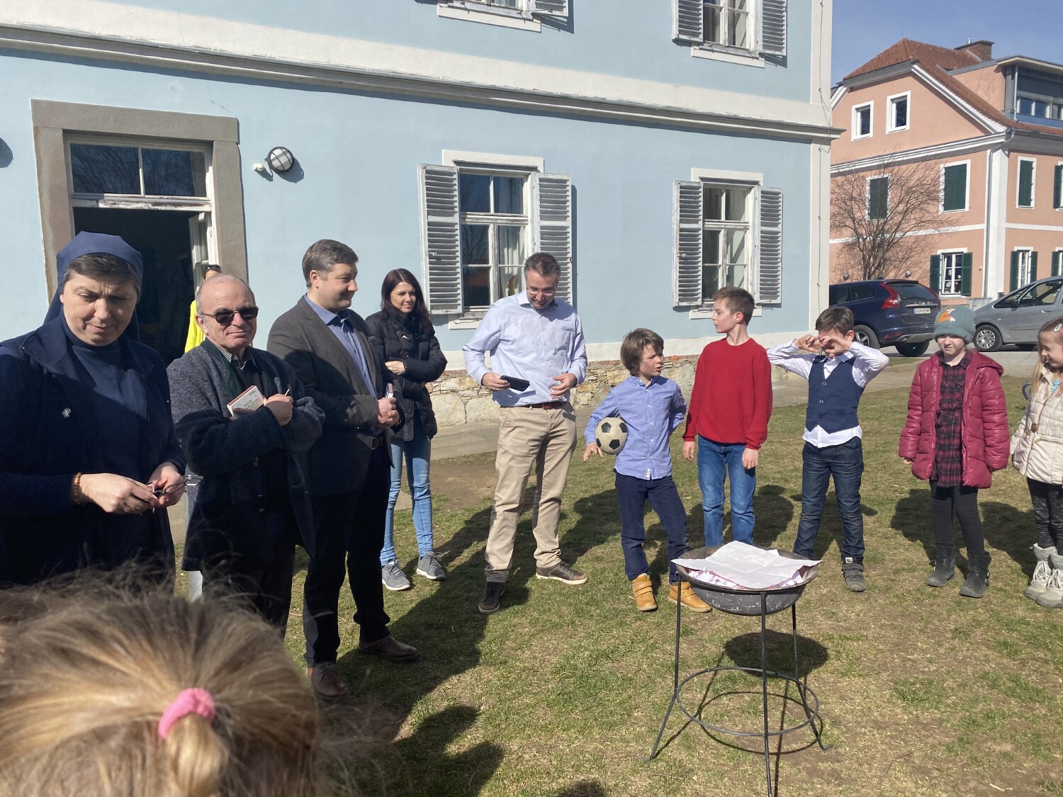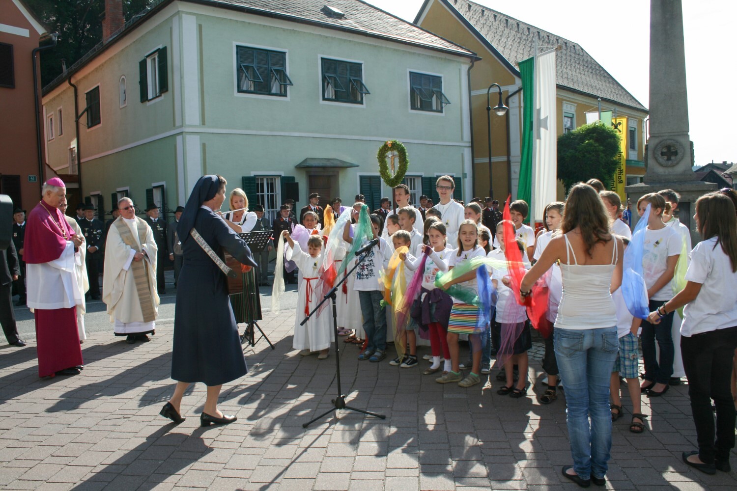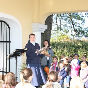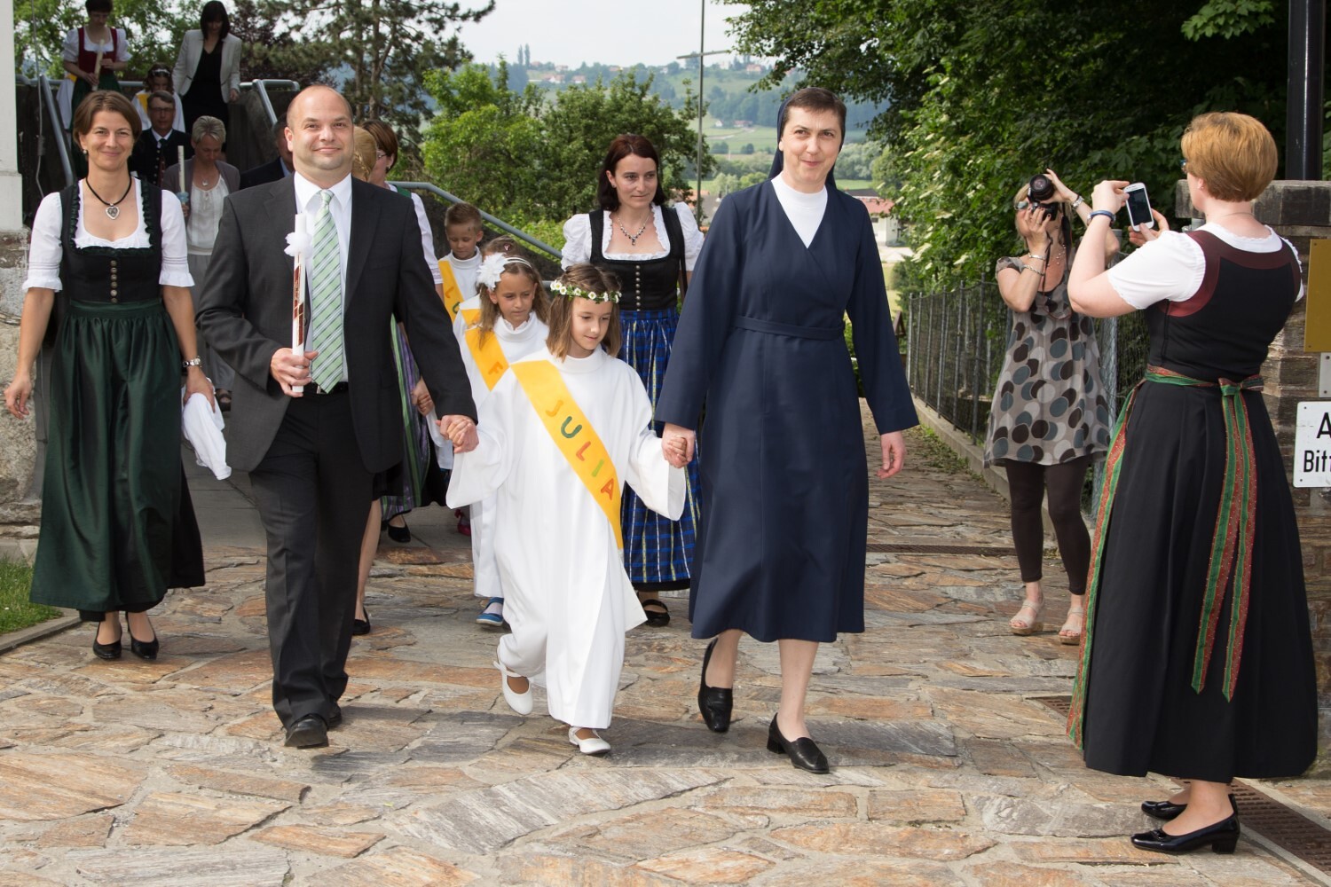 Sr. Maria begleitet die Erstkommunionkinder in den Schlosshof.