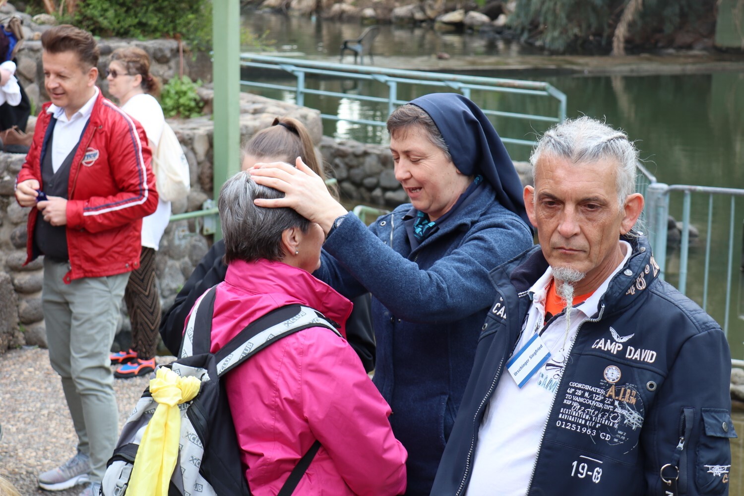 Sr. Maria spendet am Fluss Jordan den Mitreisenden den Einzelsegen.