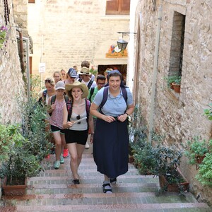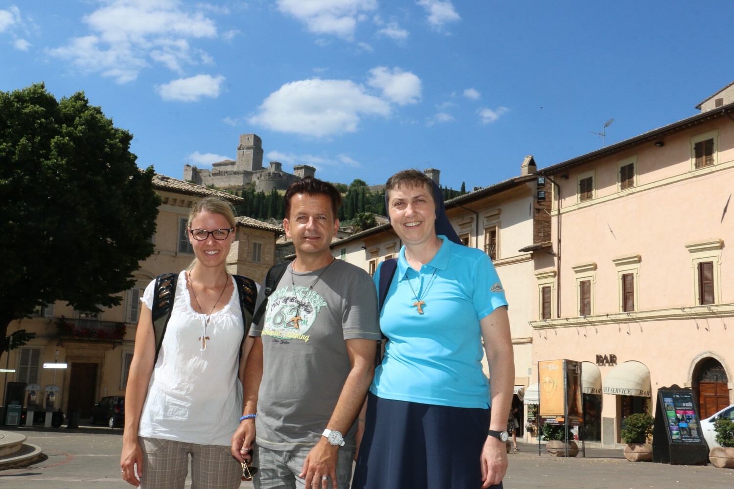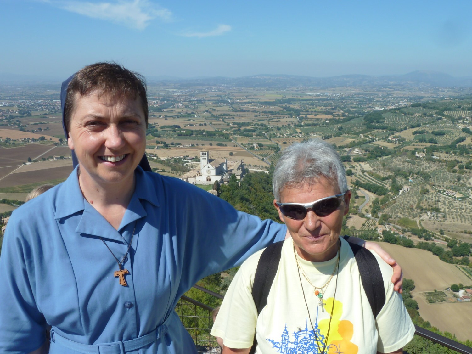 Am Ausblicksturm der Burg Rocca: Sr. Maria und Luise, im Hintergrund die Kirche San Francesco