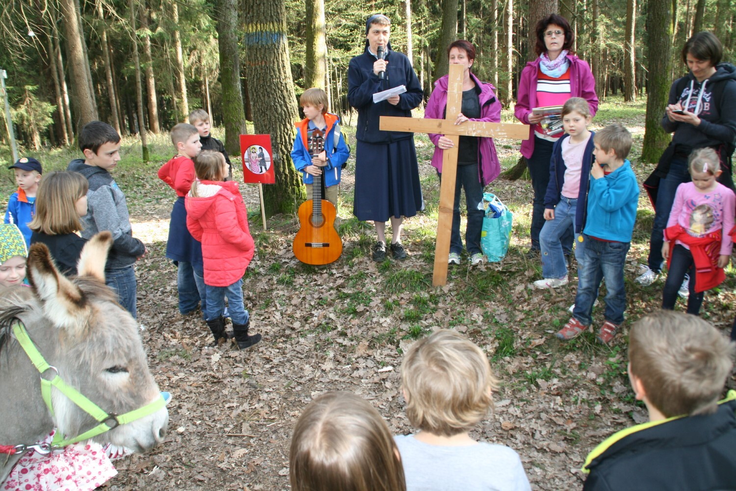 Die Kinder spielen das Evangelium, während Sr. Maria den Evangelisten liest. Jesus wird von Pastoralreferentin Ines Kvar gespielt.