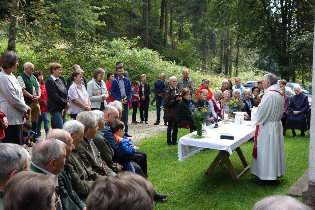 In Vertretung des Fußwallfahrers P. Simon zelebrierte Franziskaner-Guardian P. Josef Höller aus Graz in launiger Weise die Eucharistie, zu der rund 80 Gläubige bei herrlichem Wetter zu Fuß, mit den Fahrrädern oder per Auto gekommen sind.
